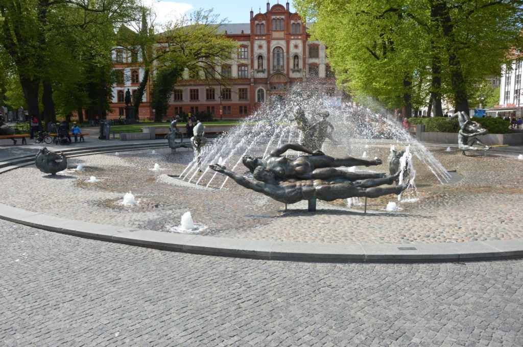 Auf dem Universitätsplatz, Früher „Stalinplatz“Bei seiner Eröffnung regte die Gestaltung des Brunnens zu zahlreichen Diskussionen an, genauso wie man das von einem Kunstwerk erwarten sollte.Nur in der Mitte befindet sich ein kleines Wasserbecken, der Rest des Brunnens ist begehbar, was vor allem die Kinder im Sommer gerne nutzen.Heute ist der Brunnen aus dem Rostocker Zentrum nicht mehr wegzudenken. Schön, das er in der heutigen Zeit komplett erhalten wurde, wenn ich da an Dresden denke……