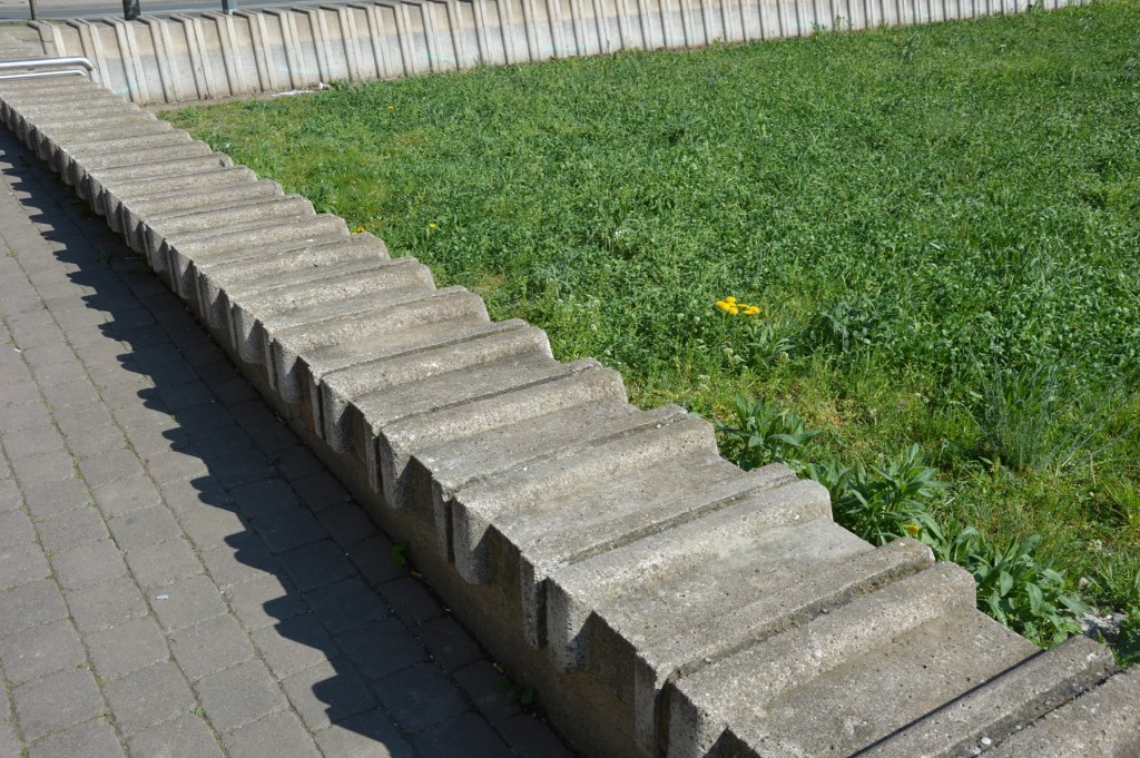 Rand der ehemaligen Wasserspiele im Gebäudeensemble aus Betonformsteinen. Man kann noch deutlich die Wassergrenze erkennen.