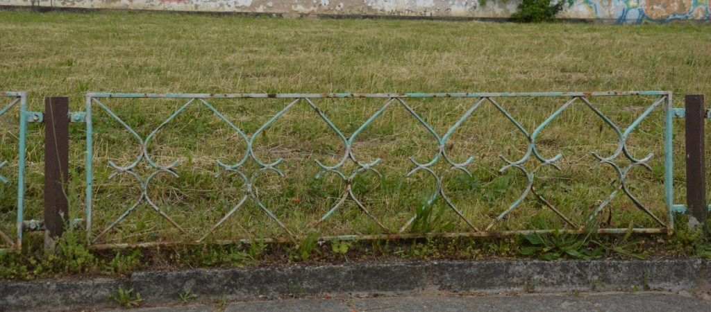 Niedriger Zaun als Grünflächenschutz. Alter ca. 45 Jahre, letzter Anstrich vermutlich an einem Subbotnik Ende der 80-ger Jahre. Dafür ist er noch gut erhalten.
