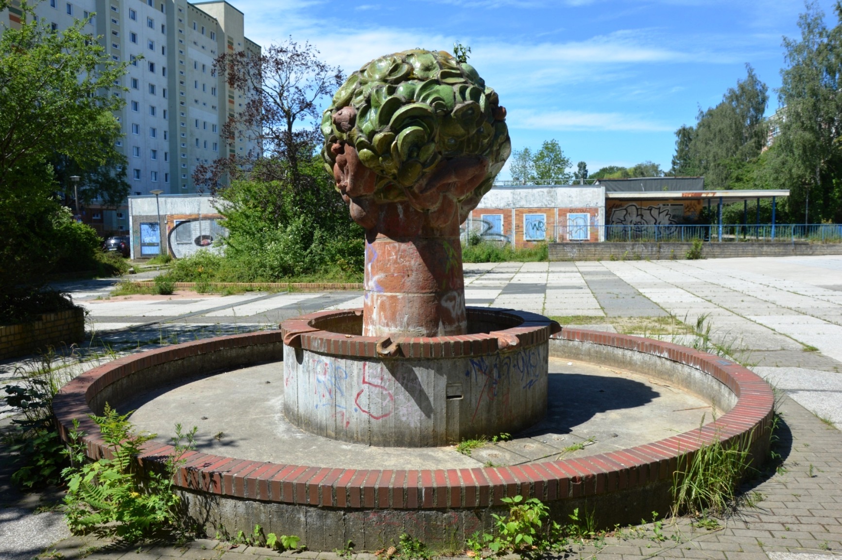 Außer diesem verwahrlosten Brunnen gab es noch ein Ensemble von 7 quadratischen Brunnen, deren Beckenboden mit Glasmosaiken gestaltet war. Diese werden zur Zeit saniert.