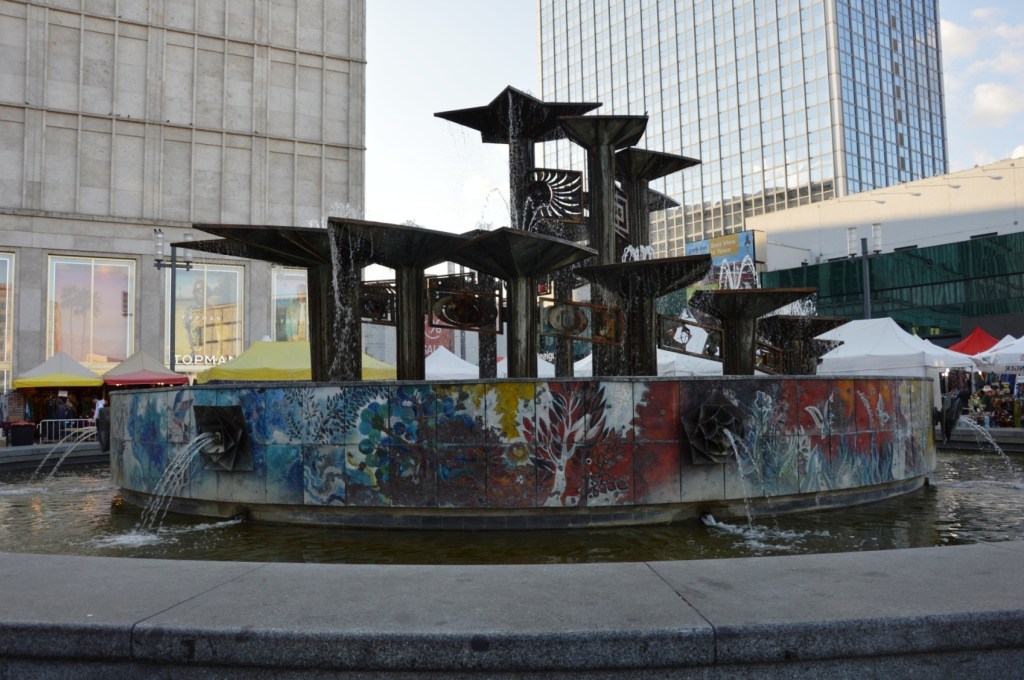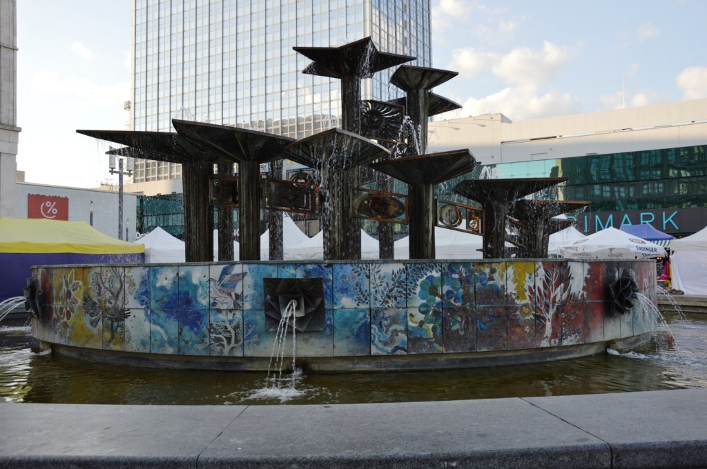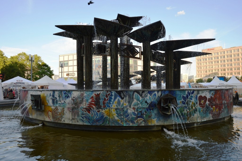 Der ganze Brunnen ist ein einziges Kunstwerk. Vor allem die sehr farbenfrohen Emailleplatten, die den Brunnen umrunden.Hier aus einer anderen Richtung.Leider war so etwas wie ein afrikanischer Wochenmarkt. Die Zelte und deren „Musikbeschallung“ hatten Kontakt zu dem Brunnen. Vielleicht gibt es hier auch noch mal besinnlichere Zeiten. Man kann doch nicht immer und überall und zu jeder Zeit shoppen?