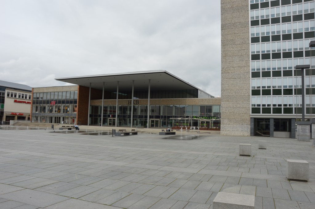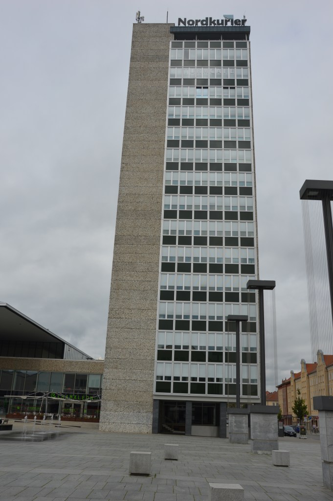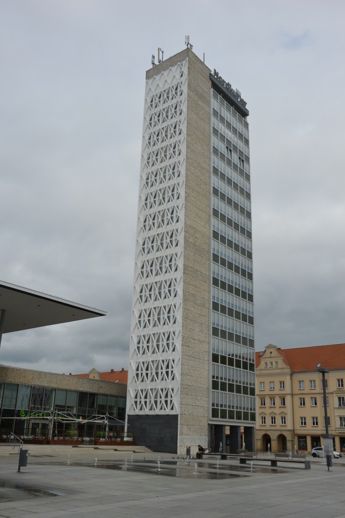 Architektur von Iris Grund. Ein 56 m hoher Stahlskelettbau mit vorgehängter Fassade. Für die Bevölkerung befanden sich im Gebäudekomplex eine Ausstellungshalle, ein Mehrzwecksaal und Räumlichkeiten für über 50 Arbeitsgemeinschaften.