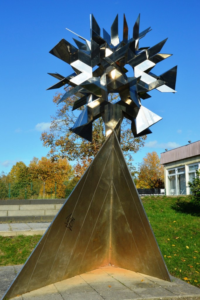 Schwerin, Pankower Straße. Diese Skulptur wurde als Wahrzeichen der gleichnamigen Eisdiele erstellt, die sich in dem am linken Bildrand sichtbaren Flachbau befand.