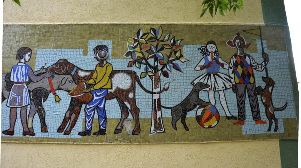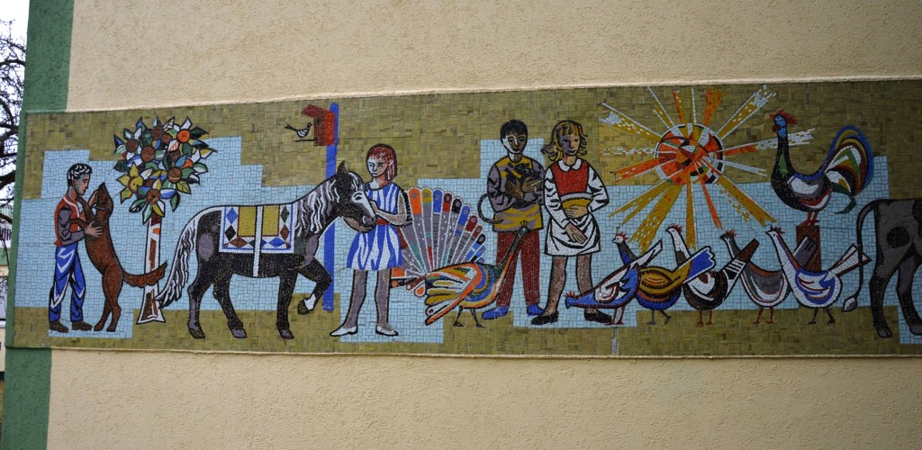 Schwedt, Justus-von-Liebig-StraßeLinker Bereich des Mosaiks. Ich habe zwei junge Muttis, die auf ihre Kinder warteten, gefragt wieviele Hühner auf dem Mosaik sind.Rechter Bereich des Mosaiks.