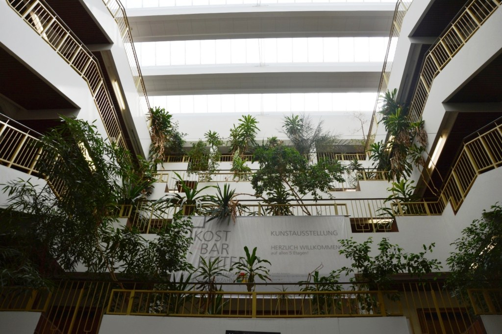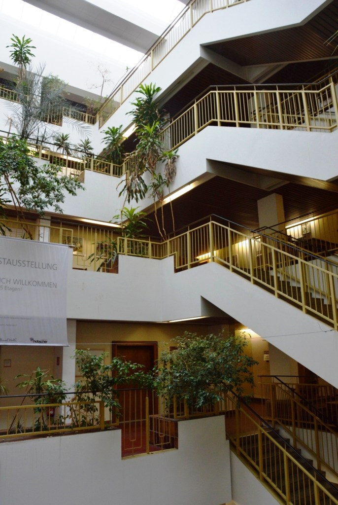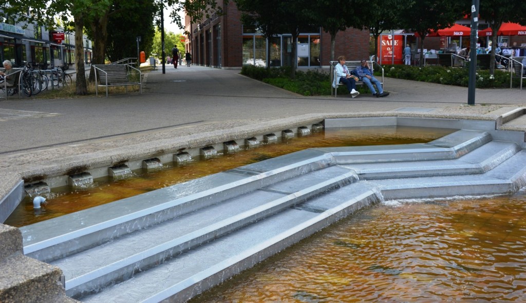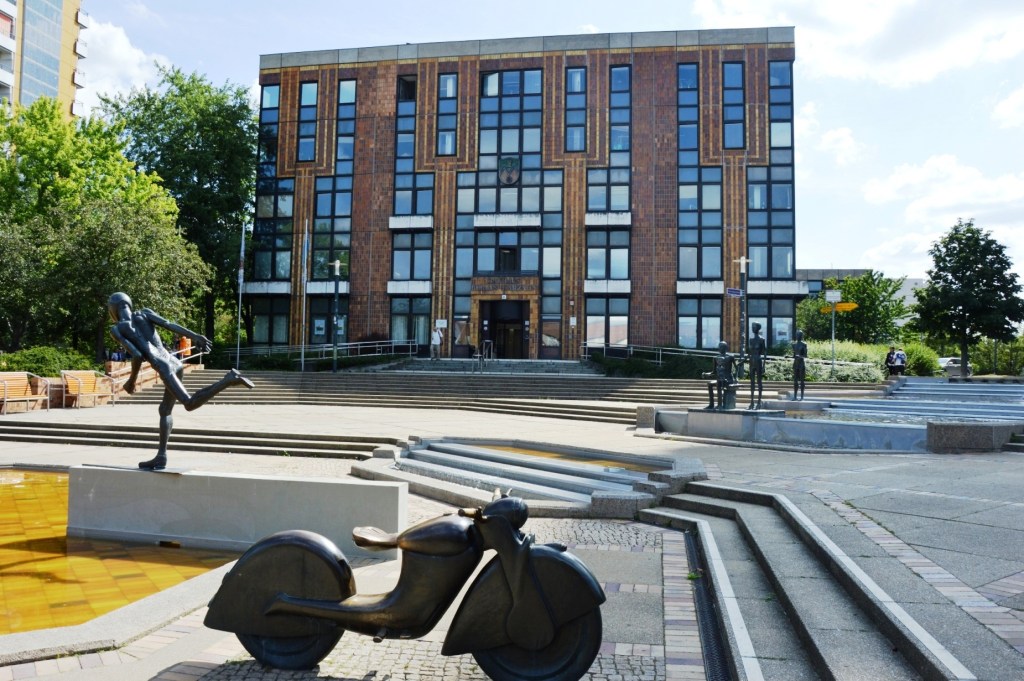 Ansicht vom Springbrunnen aus. Ein Stahlbetonskelettbau mit Fassaden aus Fertigplatten.