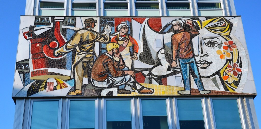Wir nannten das Gebäude immer „Das Haus mit der Bauchbinde“. Leider habe ich mir früher das Kunstwerk nie in Ruhe betrachtet. Dabei gibt es so viel zu entdecken.