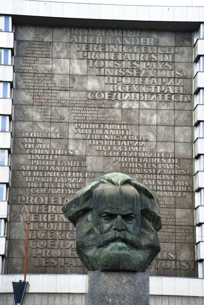 Im Hintergrund die Fassade des „Rates des Bezirks“ mit dem bekannten Zitat aus dem „Manifest der Kommunistischen Partei“, das Karl Marx und Friedrich Engels 1848 verfaßt haben.