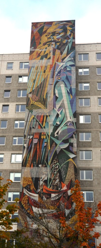 Das Bildungszentrum Halle Neustadt beherbergt heutzutage — nach dem das Mental-Institut den Plattenbau wohl satt hatte (genauso wie damals das Staatsratsgebäude der DDR, bis ein BRD-Spekulant schließlich dort einzog und seine Jünger das Bescheißen lehren durfte) — die Stadt Halle mit »Ordnungsamt« und Einwohnermeldeamt (Bürgerbüro). Dementsprechend mußte natürlich auch die Eingangs-Fassade verwestlicht werden. Von der schönen Ornament-Fensterfassade ist nichts mehr übrig geblieben. Renau’s Mosaiks bekamen nur deshalb eine Sanierung, weil man sich stark gemacht hatte sie zu erhalten. Das heißt aber noch lang nicht, daß Renau’s sozialistische Kunstwerke erhalten bleiben, so lange ein Gerüst diese umzingelt.
