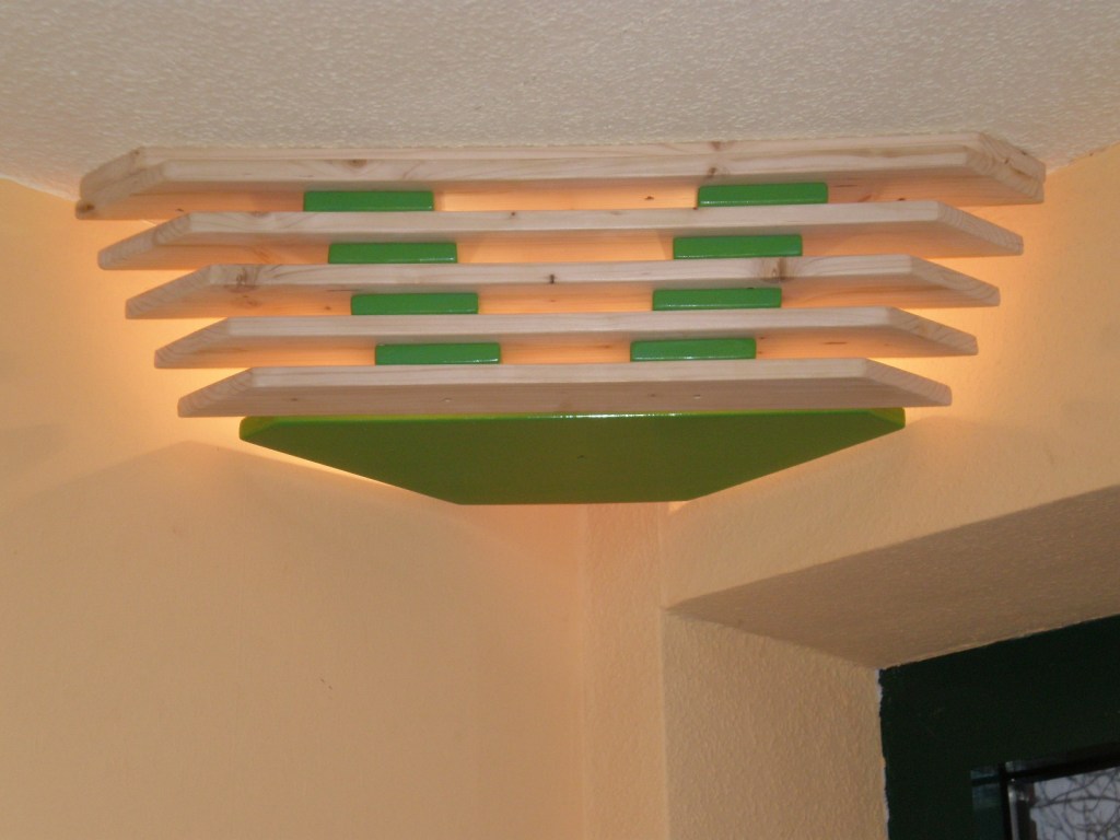 Es gibt da noch ein etwas helleres und offeneres Modell zur Beleuchtung des Zimmers. Der Aufbau dieser Lampe folgt keinem geometrischen Konzept, sondern besteht aus wahllos aneinandergeschraubten Brettern. Die Idee dazu kam mir beim Jenga spielen. Hier sind zwei 40 Watt Glühbirnen verbaut.