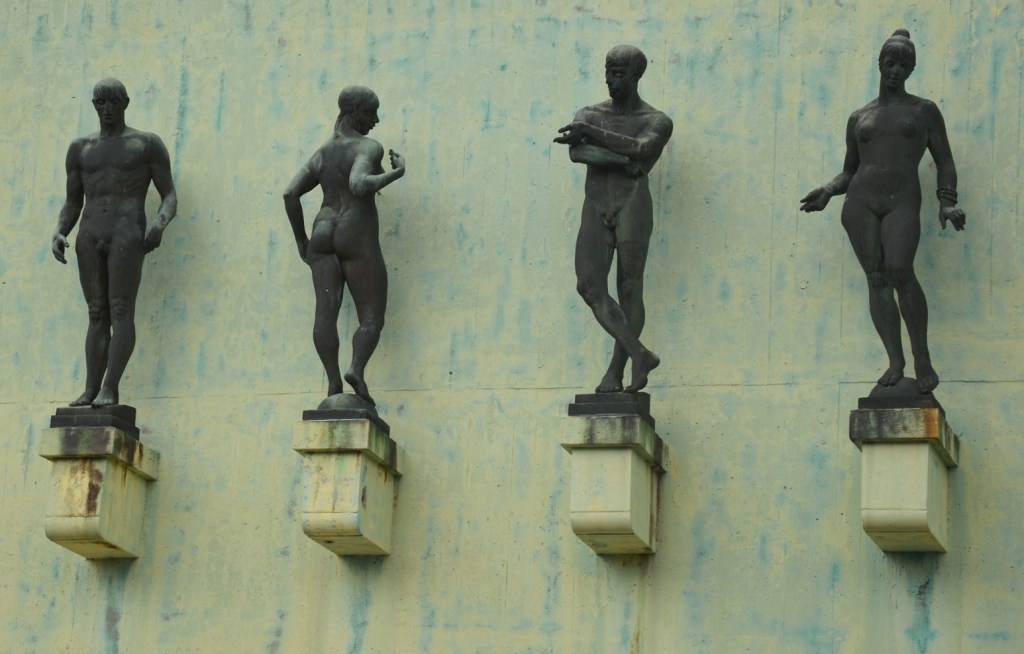 Die Figuren stehen über dem Haupteingang des Klubhauses des ehemaligen Berufsbildungszentrums.