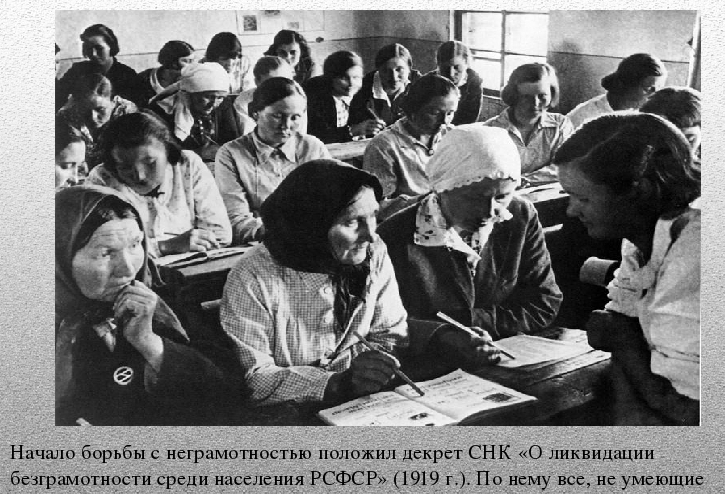 Die weitsichtige Politik der Bolschewiki in dieser Zeit zeigt sich darin, dass unter schwierigsten Bedingungen mit der Beseitigung des Analphabetismus begonnen wurde.