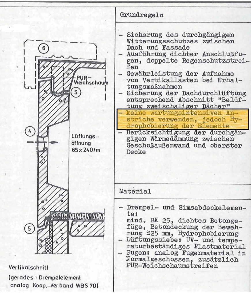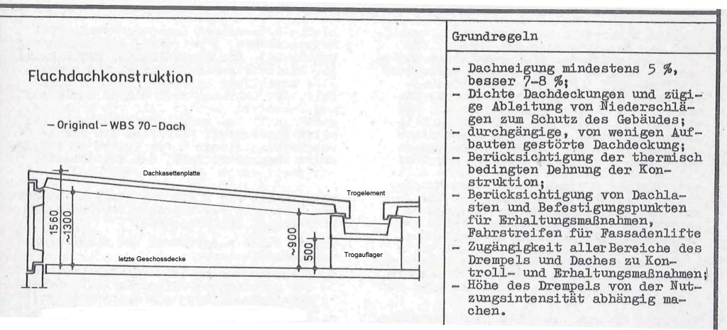 Als ich dieses Gebäude fotografiert habe, kam mir gleich der Gedanke etwas über die Dachkonstruktion des WBS 70 zu schreiben. Im WBS 70 Katalog finden sich darüber ein paar Details und Konstruktionsregeln. Abwandlungen von diesem Grundprinzip waren aus gestalterischen Gründen möglich, wenn die Konstruktionsregeln dem Sinn nach eingehalten wurden. In Berlin gab es Drempelelemente in schräger Ausführung, später entstanden daraus Mansardelemente.