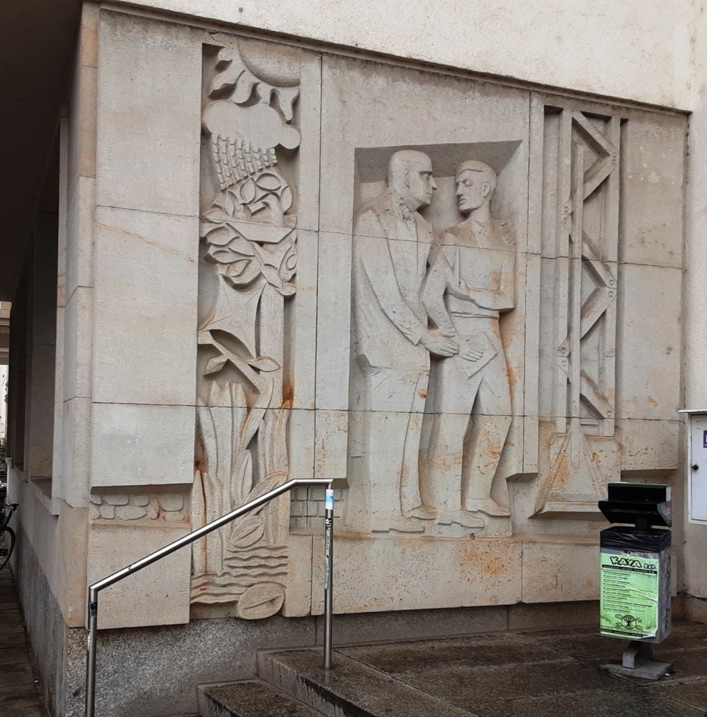 Relief am Eingangsbereich. Leider etwas verschandelt durch die superwichtige Information auf dem Mülleimer.