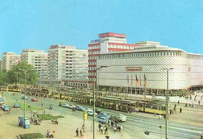 Auf einer alten Postkarte ist der gesamte Gebäudekomplex am Tröndlerring zu sehen. Direkt an das Kaufhaus schließt sich eine aufgelockerte Bebauung, bestehend aus Verwaltungsgebäuden und eingefügten eingeschossigen Ladenbereichen an.