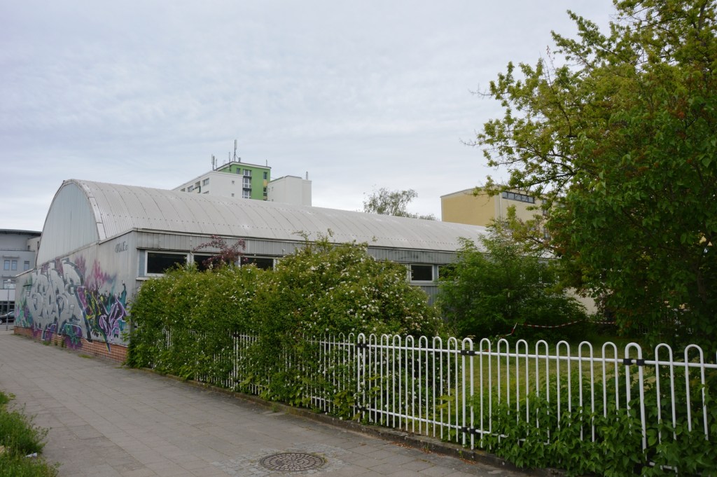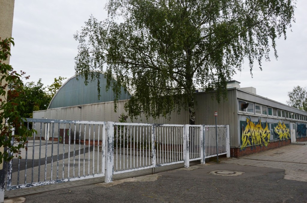 Ganz plötzlich zeigte sich bei einem Spaziergang die „Tonne“. Die typische Sporthalle für Schulen in Kleinstädten. Sie zu fotografieren ging nur von der Straße, da die Schulkomplexe zu dieser Zeit geschlossen waren. Trotzdem kann man von außen gut die Funktionen der einzelnen Baubereiche erkennen. Direkt unter der Tonnen befand sich der Hallenbereich. Im größeren Anbau war ziemlich mittig der Eingang angeordnet und von diesem ging es zu beiden Seiten in die Umkleide- und Sanitärräume. Auch die Lehrerzimmer waren hier untergebracht. Vom Hallenbereich gelangte man meistens über klappbare Sprossenwände in den kleineren Anbau, wo die Sportgeräte, Kasten und Böcke, Sprungbretter, die beliebten Medizinbälle und die Sprungmatten untergebracht waren.