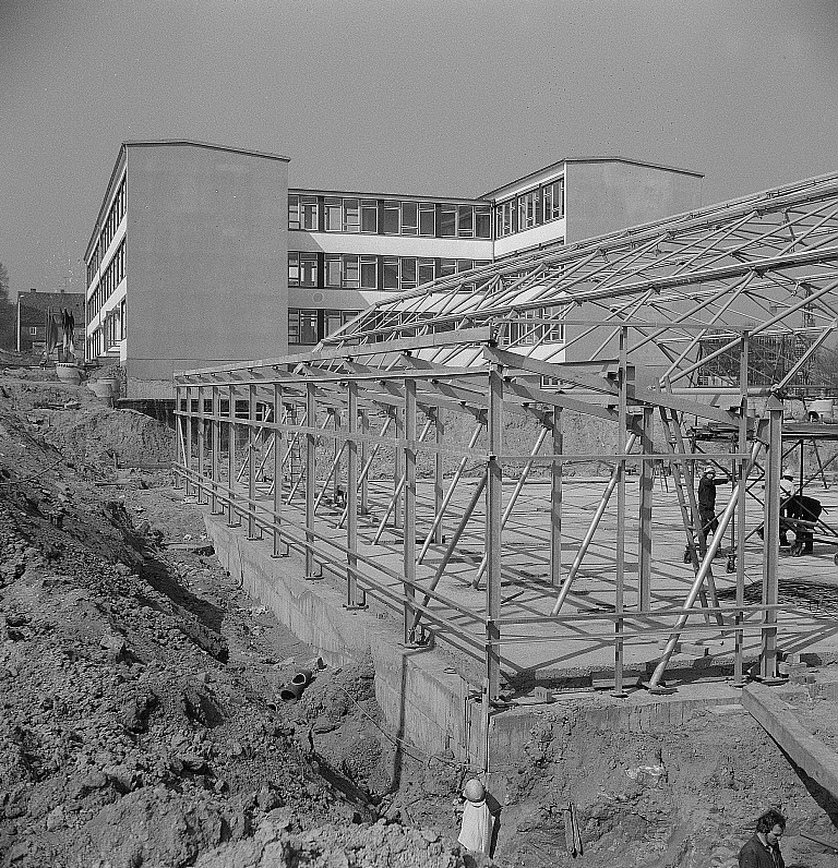 Das Tragwerk ist hier sehr interessant. Die Gründung auf einer Stahlbetonbodenplatte wurde örtlich hergestellt und darauf die vorfertigte Halle montiert. Das Tragwerk der Halle ist ein räumliches Bogentragwerk. Um dieses zu berechnen ist schon ein etwas größerer Planungsaufwand erforderlich. Da dieser Bereich jedoch ein WV-Projekt (Wiederverwendungsprojekt) ist, war dieser Aufwand bezogen auf die große Anzahl der gebauten Hallen sehr gering. Durch den großen Vorfertigungsgrad der gesamten Bauteile konnten also sehr ökonomisch Sporthallen mit wenigen Montagebrigaden errichtet werden.