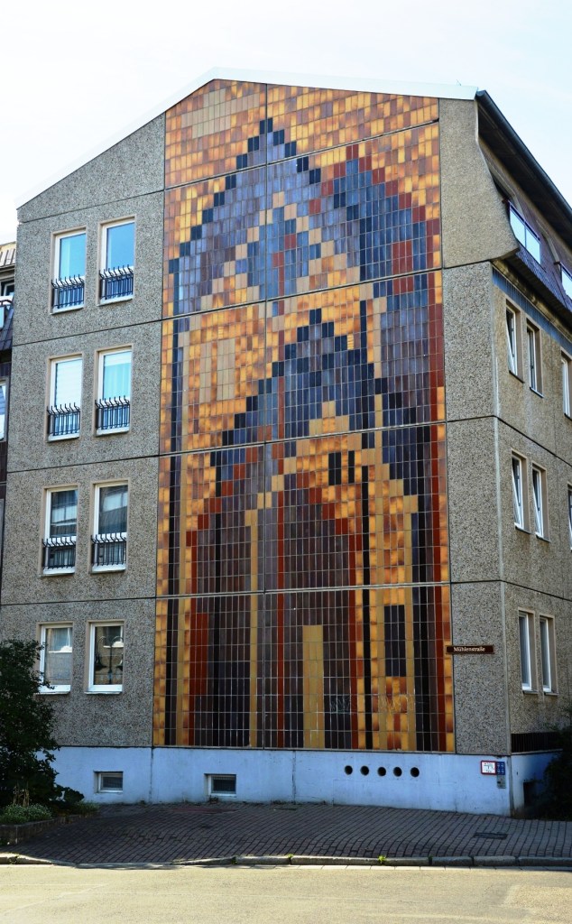 In Cottbus wurden größere Bereiche des innerstädtischen Wohnraumes in industrieller Bauweise errichtet. Die Dachformen wurden der vorhandenen Architektur angepasst, hier ein Mansarddach.