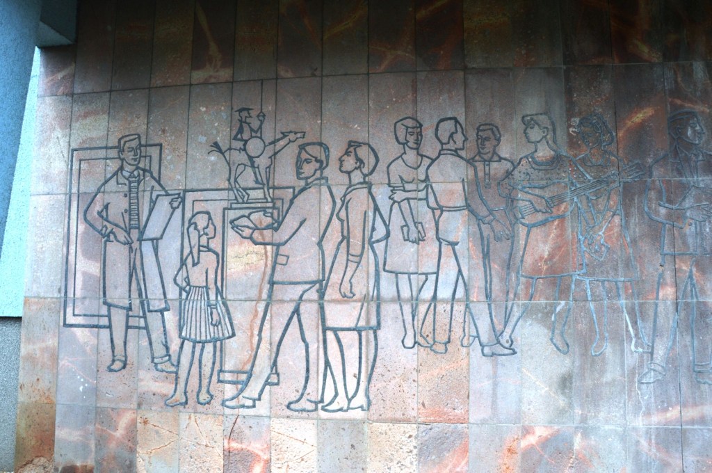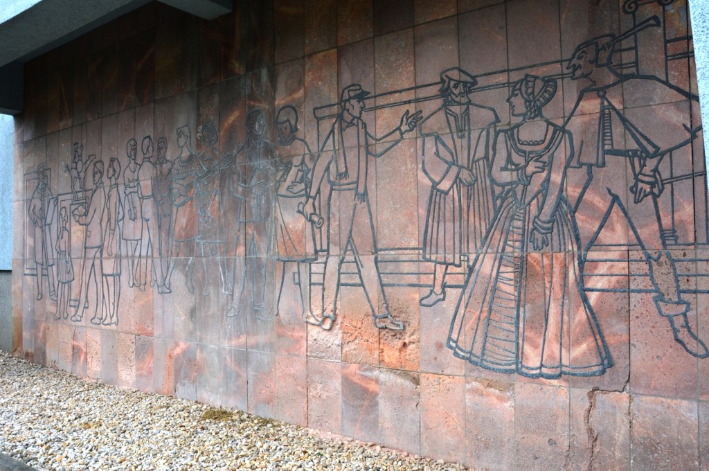 Leider nagt der Zahn der Zeit schon etwas an diesem Kunstwerk. Das Fotografieren war etwas schwierig, da genau vor dem Bild eine Mannshohe Hecke postiert war. Hinter der Hecke war dann der Winkel etwas ungünstig.