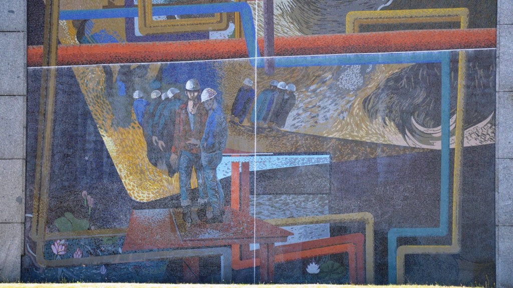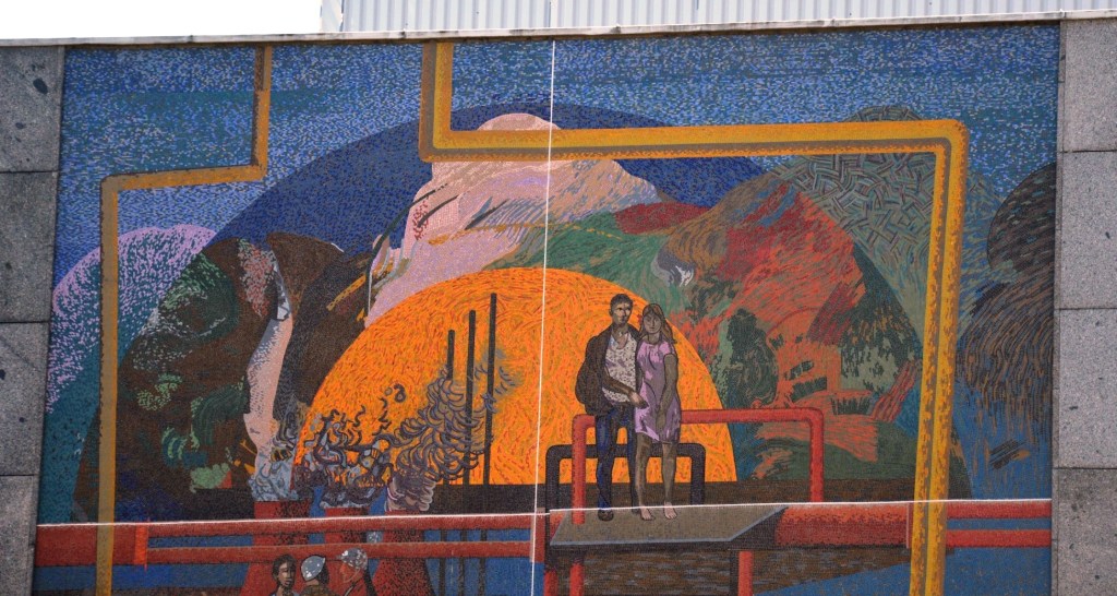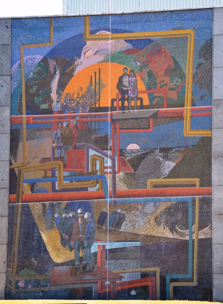 Dieses Wandmosaik schuf Fritz Eisel für das „Haus der Berg- und Energiearbeiter“ in Hoyerswerda. Es ziert den straßenseitigen Giebel dieses Kulturhauses des Volkes. 1992 wurde das Gebäude von den neuen Besitzern in Laussitzhalle umbenannt. Fotos 2020Im unteren Drittel ist der Gewinnungsprozess der Braunkahle dargestellt.Das Wandbild entstand in der Blütezeit der Stadt Hoyerswerda. Viele Arbeiter des VEB Gaskombinat Schwarze Pumpe hatten hier ihre Wohnung und ihr soziales Umfeld.Der obere Teil des Bildes. Auch hier stehen die Menschen im Mittelpunkt des Kunstwerkes und genießen die Früchte ihrer Arbeit.