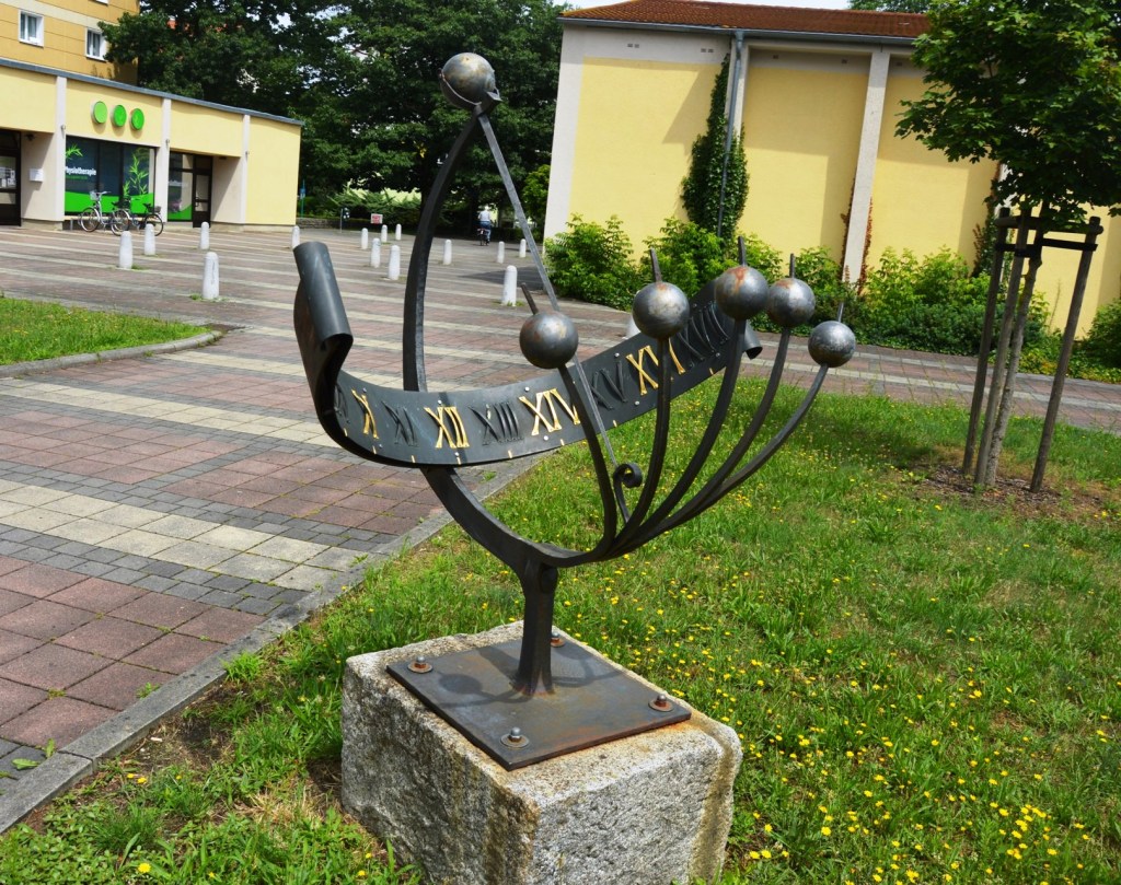 Diese Sonnenuhr stand früher im Wohnkomplex VI. In diesem Komplex wurden nach dem Ende der Blütezeit von Hoyerswerda einige Wohn- und Gesellschaftsbauten abgerissen. Vielleicht wurde sie aus diesem Grund zu ihrem jetzigen Standort, dem ehemaligen Versorgungszentrum des Wohnkomplex I umgesetzt.