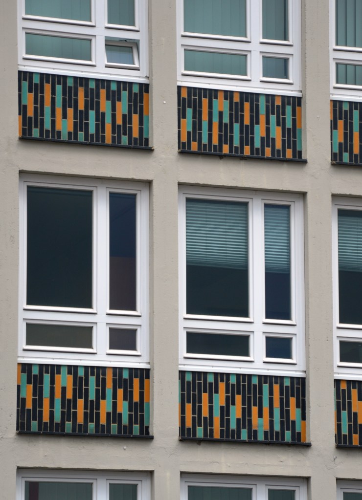 Das Gebäude ist als Skelettbau aus Stahlbeton ausgeführt. Die Brüstungen der Fassade sind mit farbigen Keramikfliesen gestaltet. Auf der Hofseite befindet sich ein außenliegendes Treppenhaus mit Farbglasfenstern. Leider habe ich dieses nicht fotografiert.
