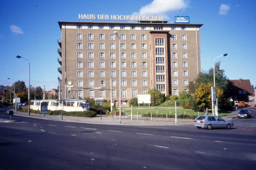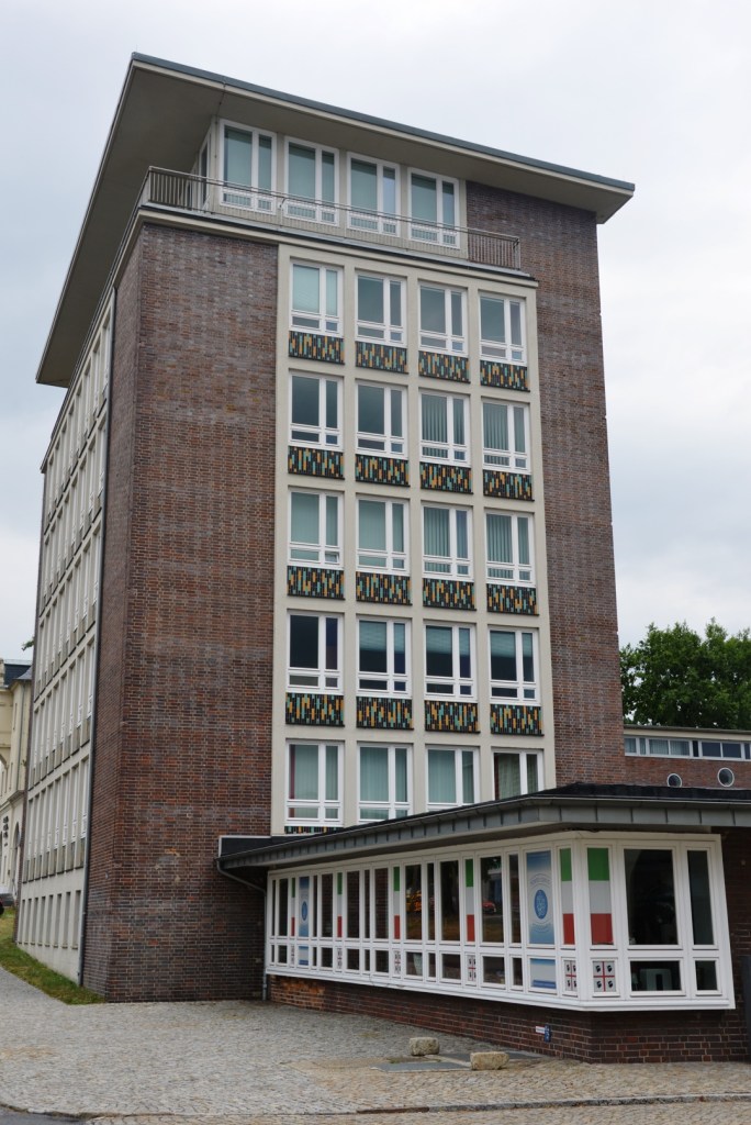 Interessant ist das zurückgesetzte Dachgeschoß, dass mit einem schlanken Stahlbetondach versehen ist. Dieser Baustil zeichnet viele Gesellschaftsbauten und auch Wohnhochhäuser in der DDR der späten 1950-er und frühen 1960-er Jahre aus.