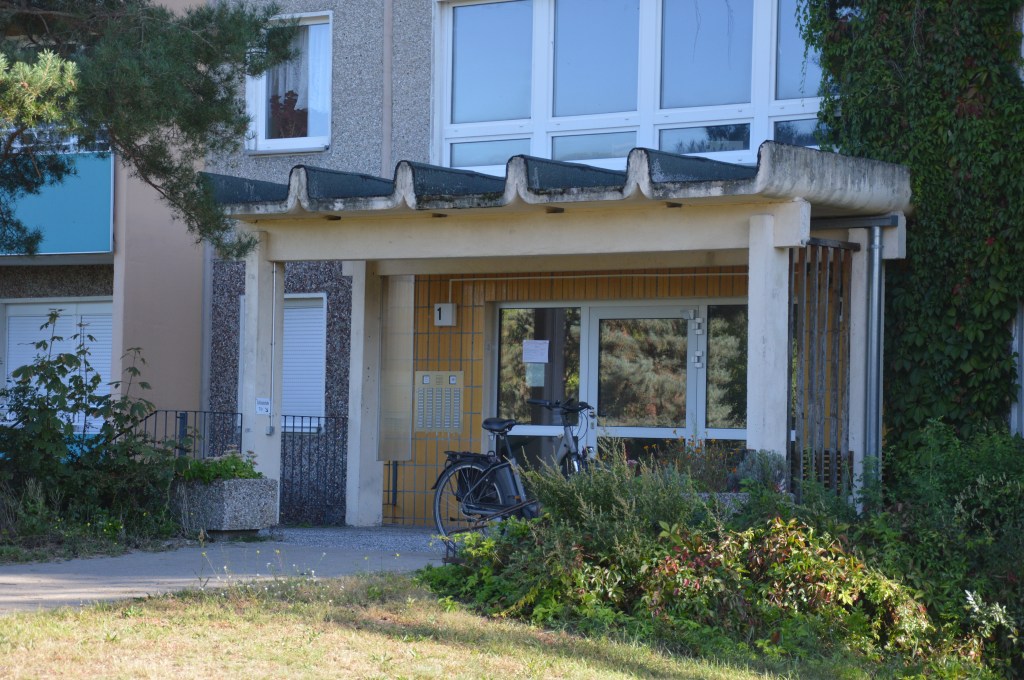 Hier habe ich eine anspruchsvolle Eingangsüberdachung gefunden, aneinandergereihte Trog-Elemente. Manchmal wurden diese auch bei Bushaltestellen verwendet.