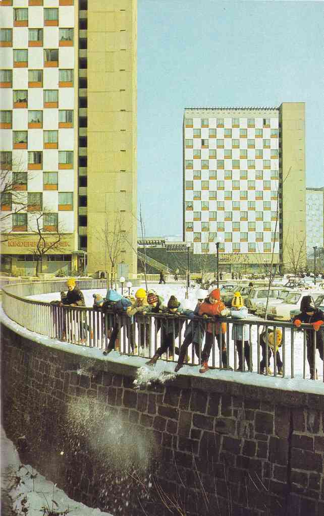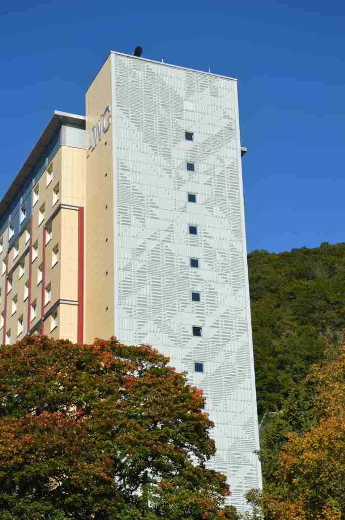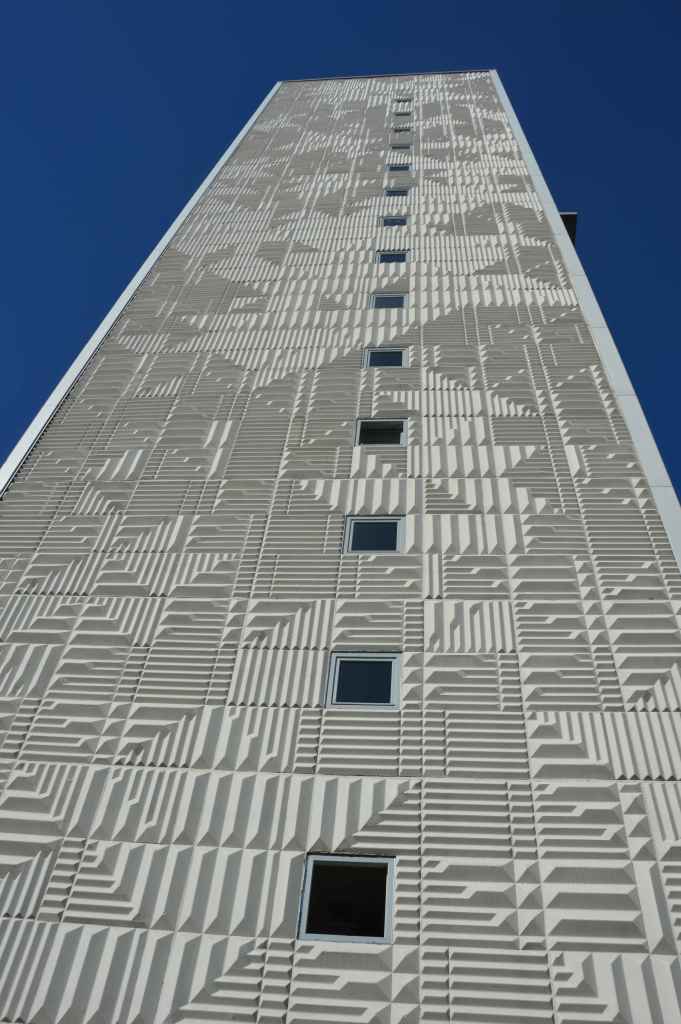 Hier kann man erkennen, dass nur der Giebel des Treppen- und Aufzugsschachtes ihr originales Aussehen behalten haben. Die markante und bekannte „Schachbrettfassade“ ist hinter einfallslosen Blechpanelen versteckt.