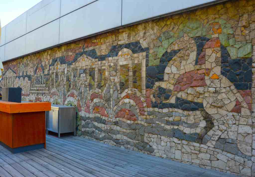 Im Erdgeschoß ziert das Natursteinmosaik „Newalandschaft“ von Franz Tippel das Gebäude.