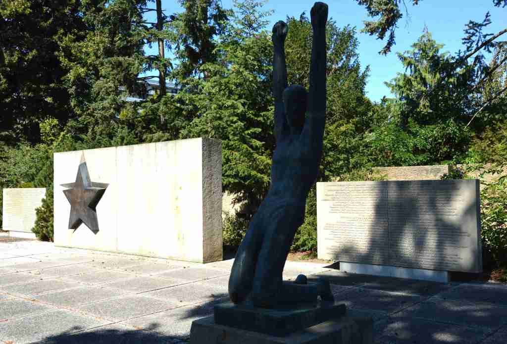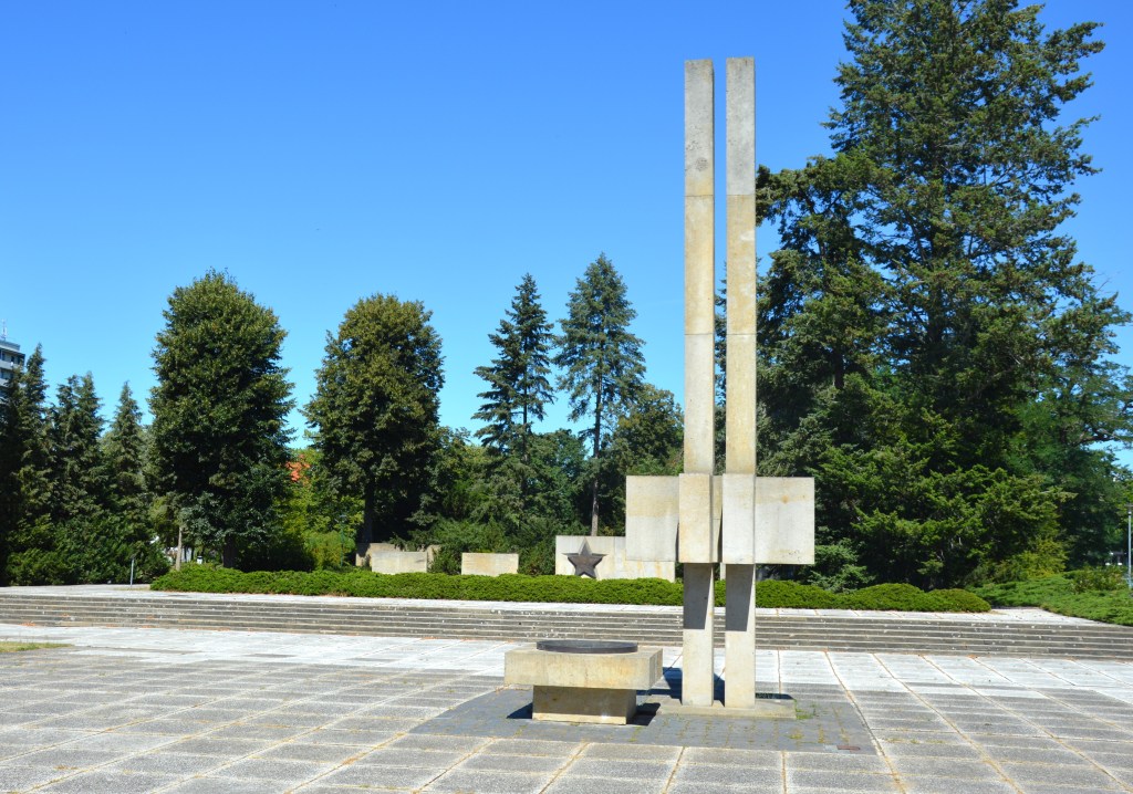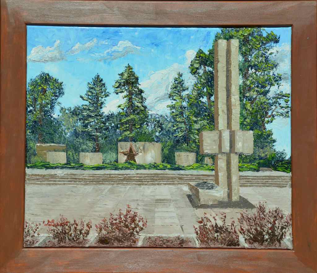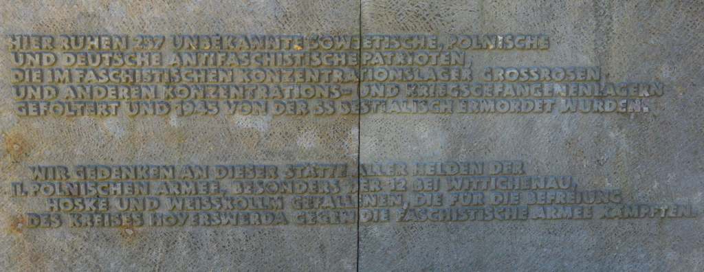 Die Anlage besteht aus einer große Fläche mit platzbreiter Treppe, ringsum große Sandsteinblöcke als Gedenktafeln mit den Namen der Toten, auf dem Platz Bronzeplastik eines Knienden mit gehobenen Armen, Sandsteinstele, alles von Jürgen von Woyski.