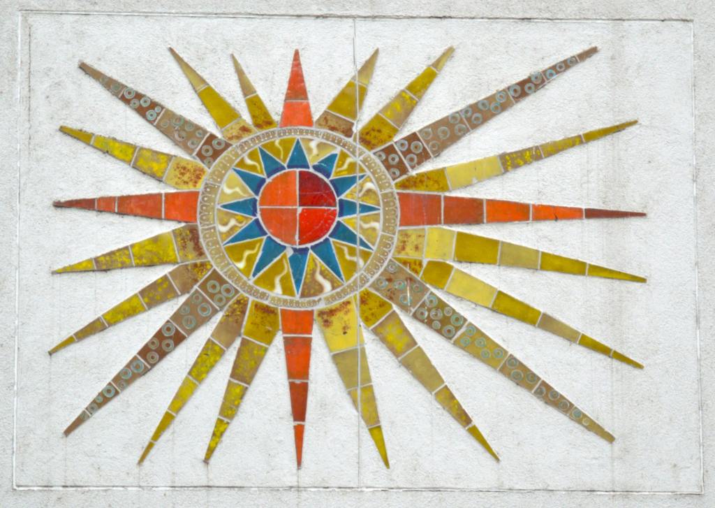 Das Wandbild wurde 1971 von dem Künstlerpaar Irmela Hadelich und Martin Hadelich erstellt.