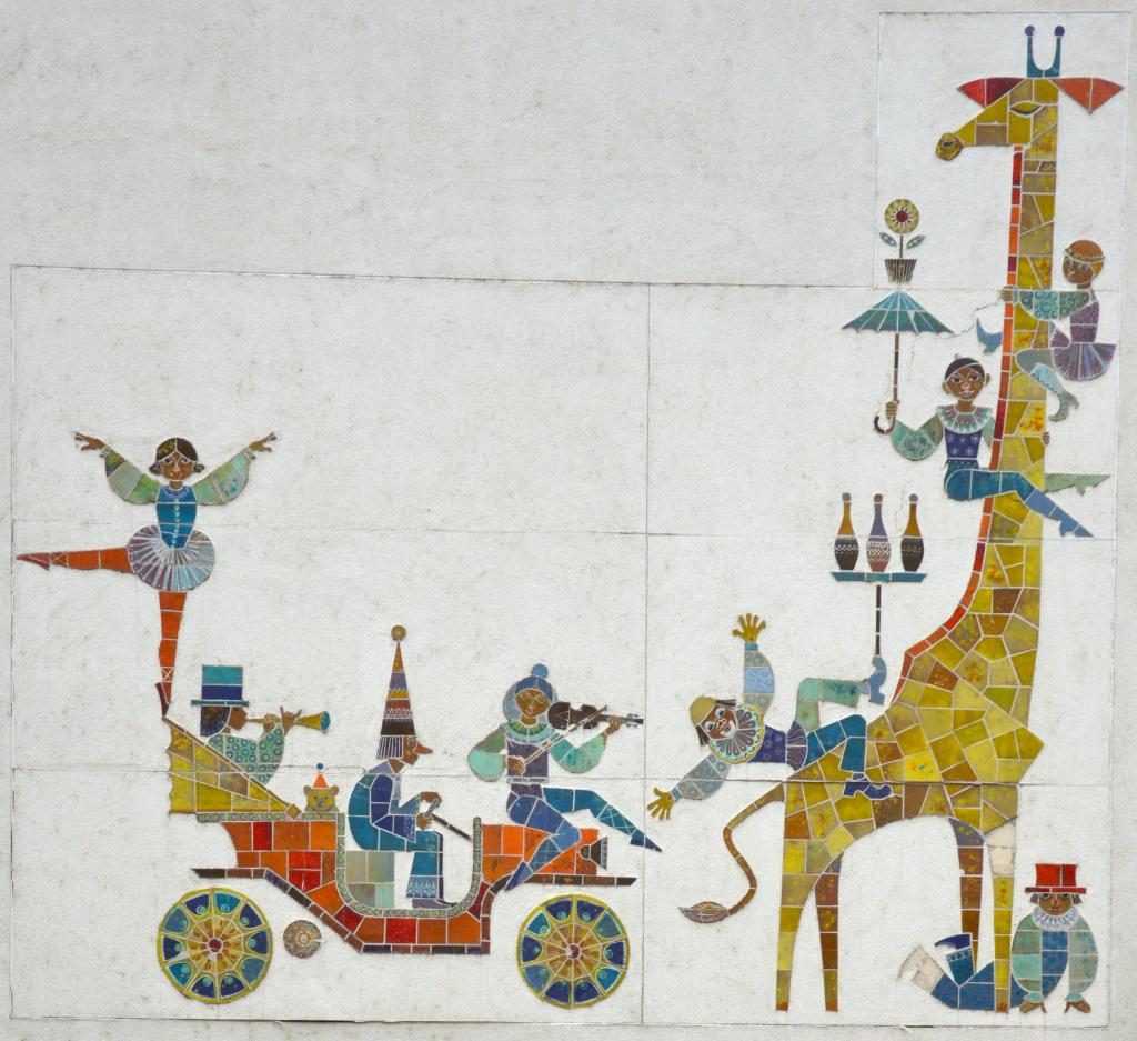 „Das Wandbild Kinderzirkus befand sich zuerst an einer anderen Kita, 1971, und wurde beim Abriss des Gebäudes in seinen Einzelteilen aufbewahrt und dann auf Platten am neuen Standort angebracht.“ Christine Rammelt-Hadelich
