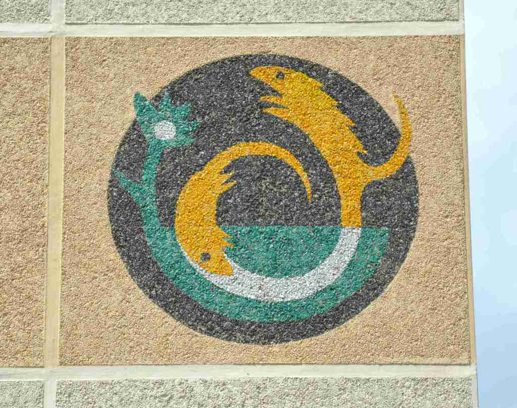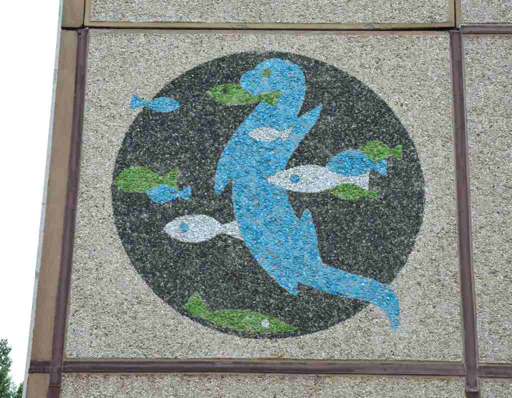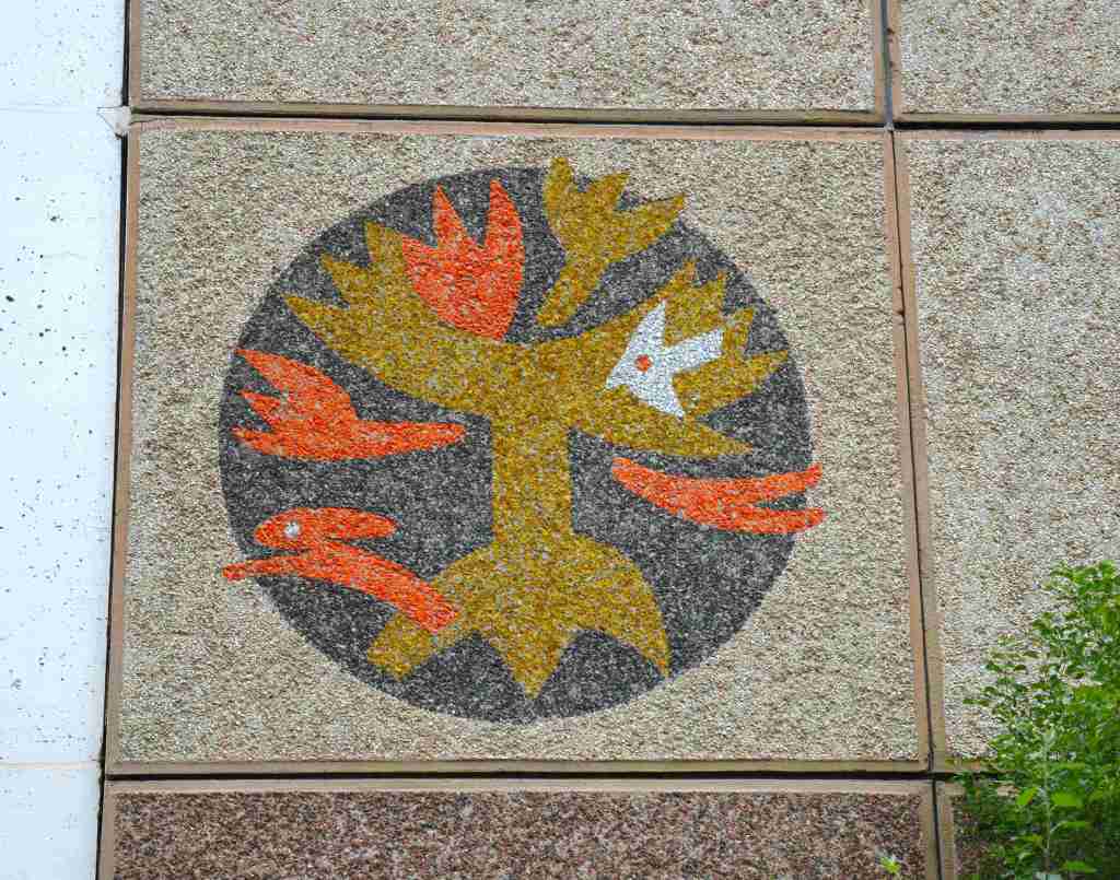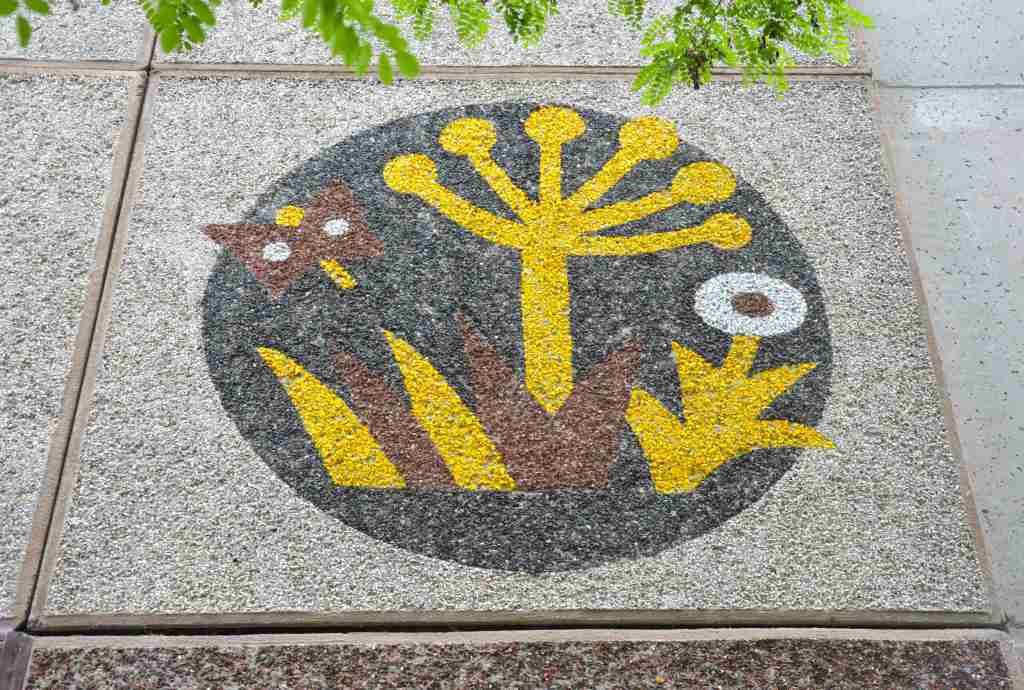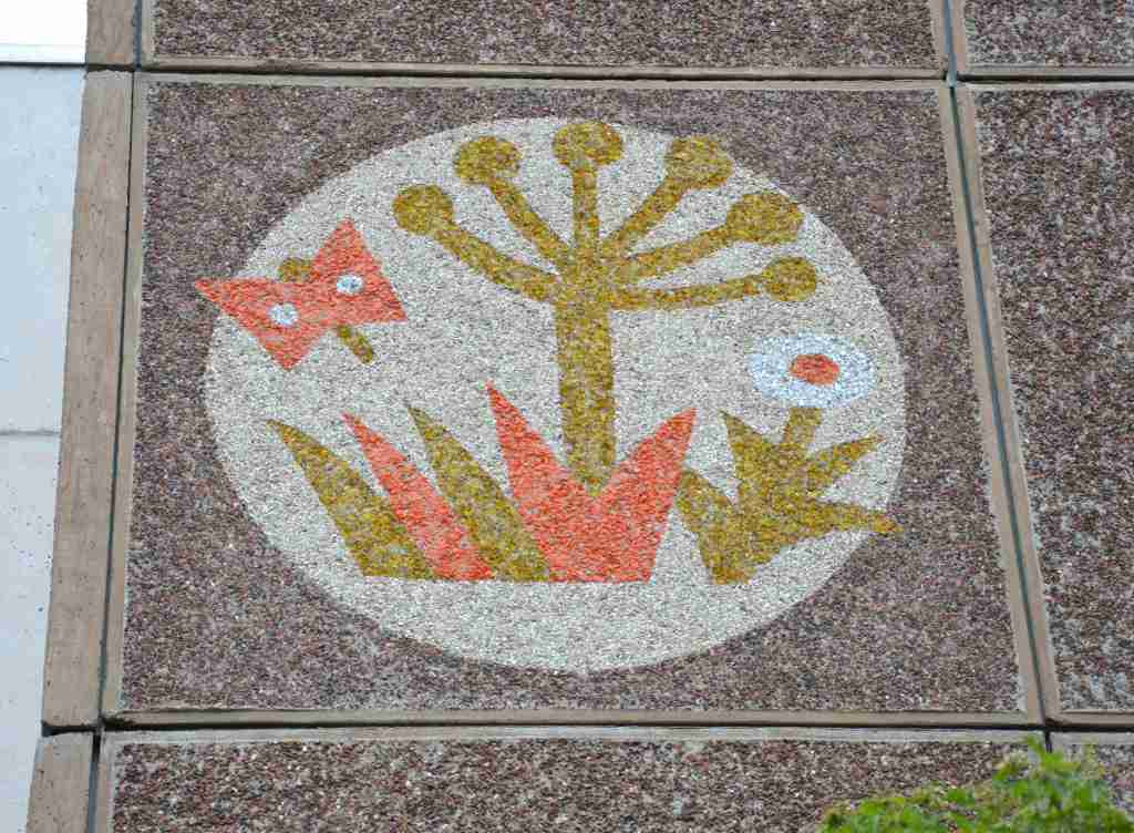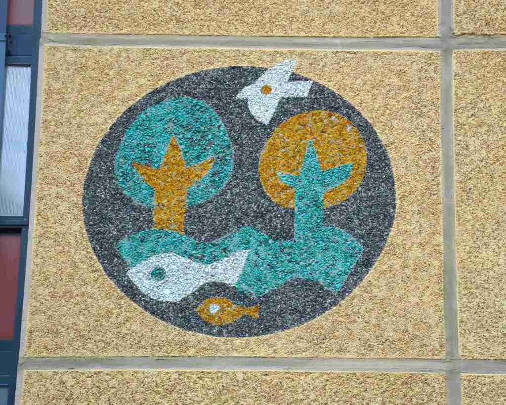 Zur Verschönerung der Wohngebäude wurden deren Giebel mit Mosaiken aus farbigen Glaskies verziert. Thematisch korrelieren diese mit den vergebenen Straßennamen.
