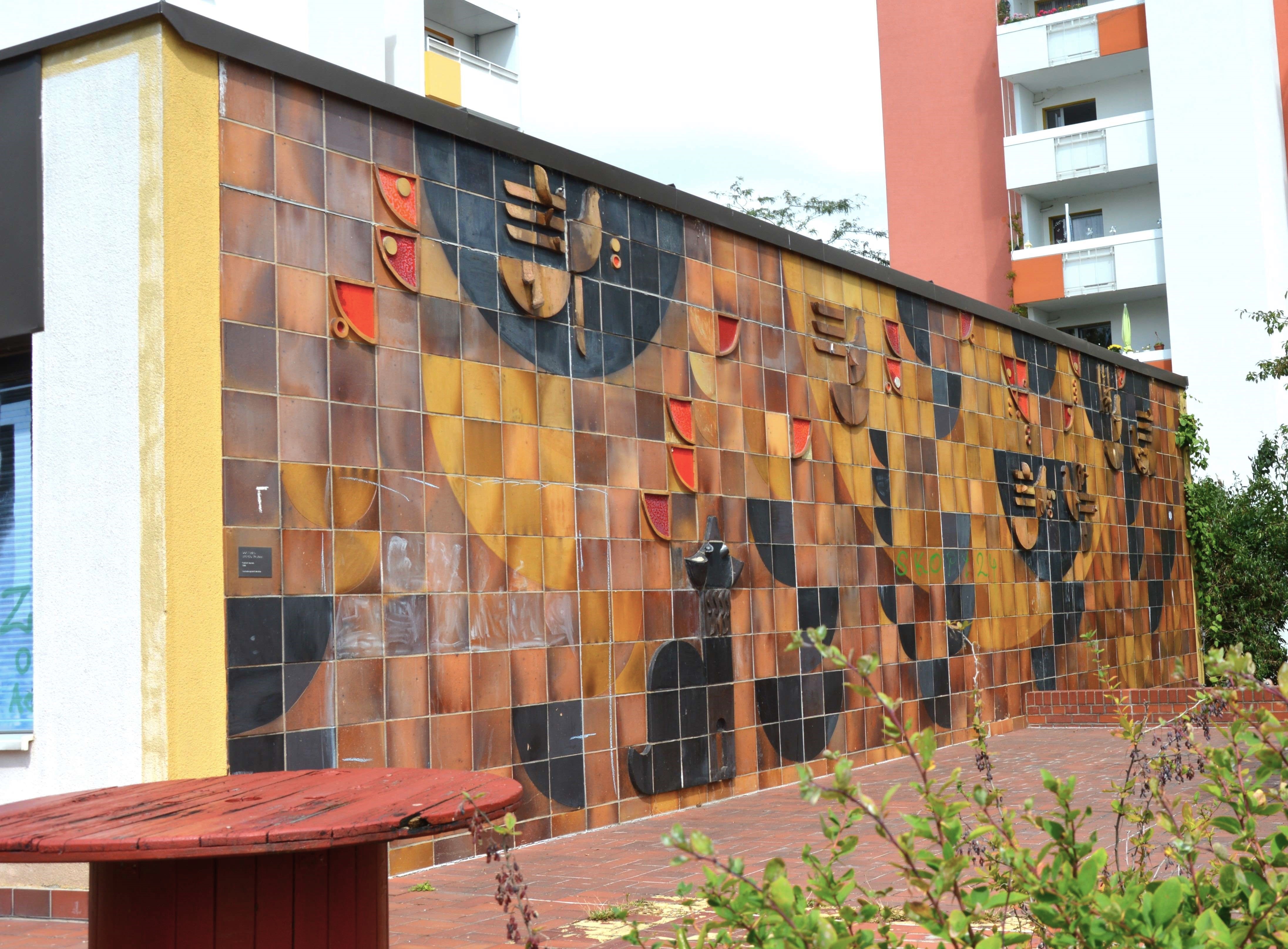 Ein Spaziergang entlang der Höhenpromenade lohnt sich. Es gibt noch ein paar interessante Objekte aus der Wohnumfeldgestaltung der DDR-Zeit zu entdecken. Das Gebäude des Biergartens ist auch mit einem schmucken Giebel versehen. Ich habe es nicht fotografiert, da der Betreiber vor der Wandgestaltung sein Gerümpel lagert.