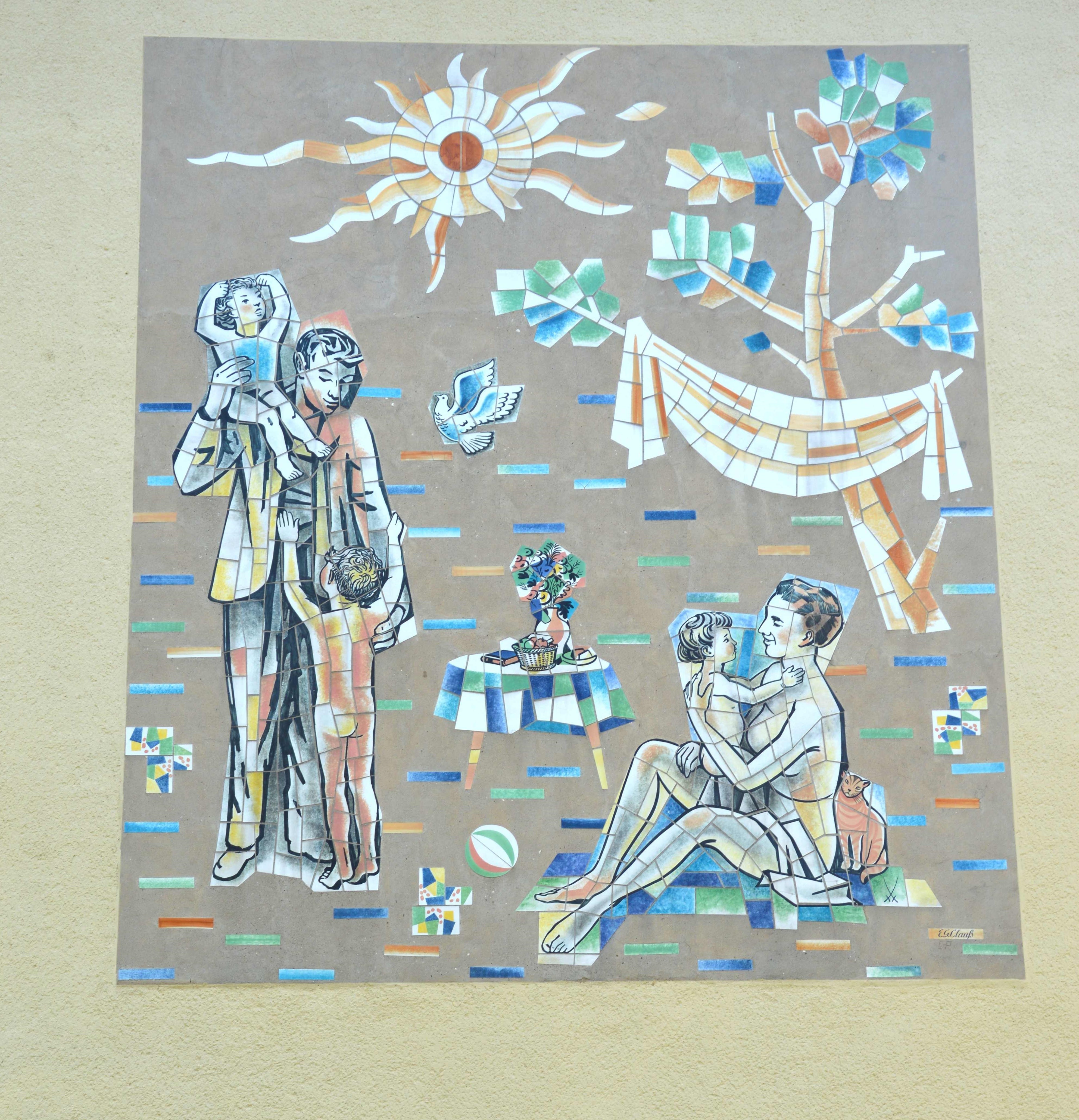 Am anderen Giebel befindet sich auch ein Wandmosaik vom gleichen Künstler.